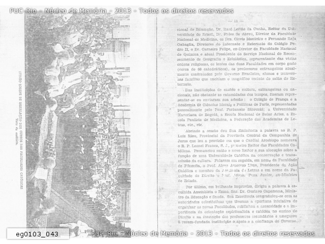 eg0103_043 | 1941 | Relato com foto da instalação solene dos cursos das Faculdades de Filosofia e de Direito das Faculdades Católicas no auditório do Colégio Santo Inácio com a presença de autoridades, políticos e eclesiásticos. (cópia em xerox) |