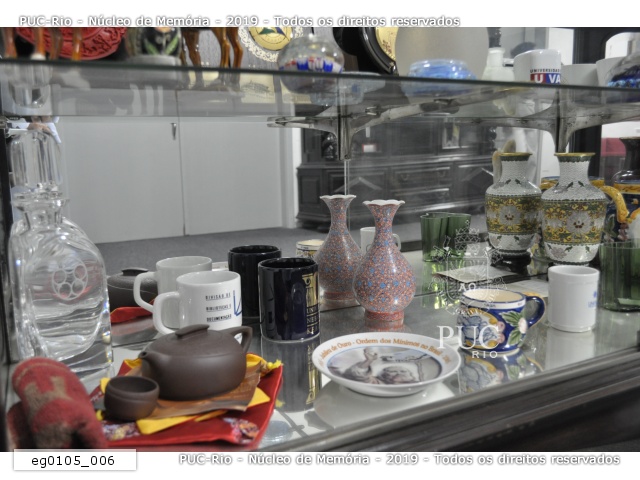eg0105_006 | 11/1/2011 | Armário da sala de entrada da reitoria da PUC-Rio com vasos, louças e memorabílias recebidas de instituições de ensino superior e empresas. |