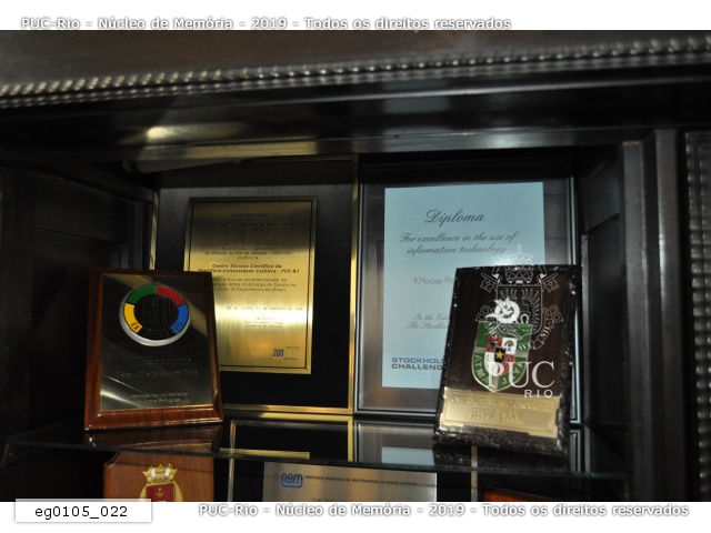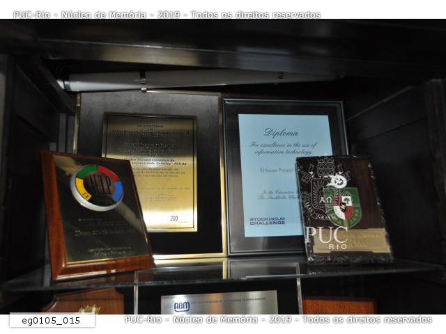 eg0105_022 | 11/1/2011 | Armário da sala de entrada da reitoria da PUC-Rio com diplomas, medalhas e placas recebidas de instituições de ensino superior e empresas. |