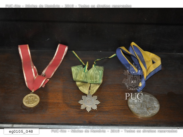 eg0105_046 | 11/1/2011 | Medalhas, placas e escultura do armário da sala de entrada da reitoria recebidas de instituições de ensino superior e empresas ou confeccionados pela PUC-Rio. |