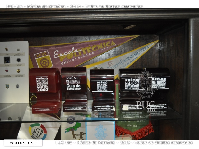 eg0105_055 | 11/1/2011 | Flâmulas, pins, bottons e prêmios de melhor universidade do armário da sala de entrada da reitoria recebidos de instituições de ensino superior e empresas ou confeccionados pela PUC-Rio. |