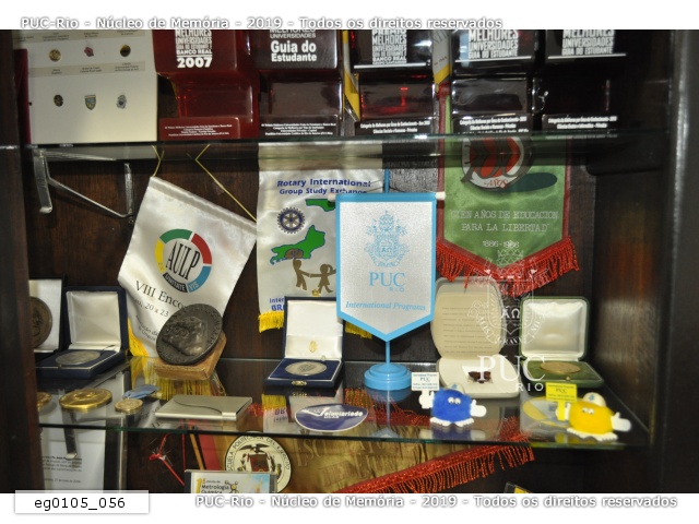 eg0105_056 | 11/1/2011 | Flâmulas, medalhas, pins, bottons, prêmios de melhor universidade e memorabílias do armário da sala de entrada da reitoria recebidos de instituições de ensino superior e empresas ou confeccionados pela PUC-Rio. |