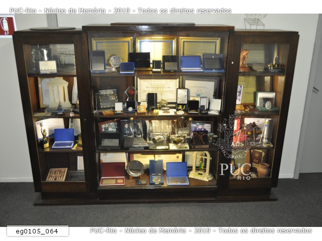 eg0105_023 | 11/1/2011 | Armário da sala de entrada da reitoria da PUC-Rio com diplomas, medalhas e placas recebidas de instituições de ensino superior e empresas. |