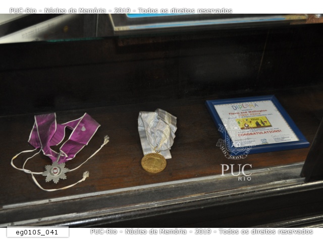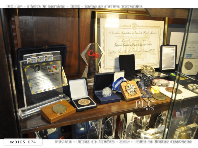 eg0105_041 | 11/1/2011 | Diplomas e medalhas do armário da sala de entrada da reitoria da PUC-Rio recebidas de instituições de ensino superior e empresas. |