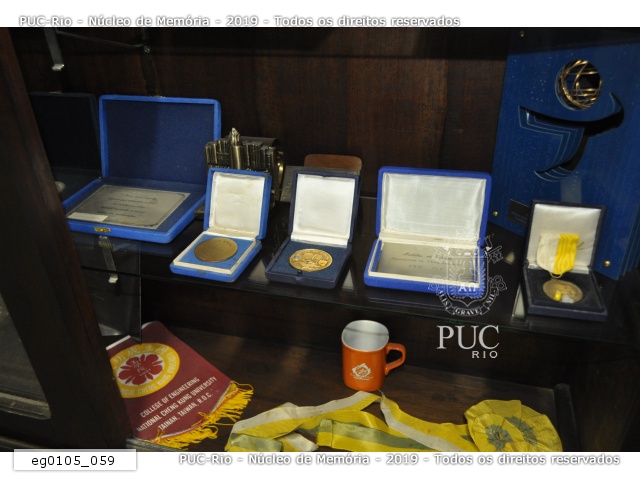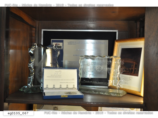 eg0105_050 | 11/1/2011 | Medalhas, esculturas, diplomas e troféu do armário da sala de entrada da reitoria recebidos de instituições de ensino superior e empresas ou confeccionados pela PUC-Rio. |