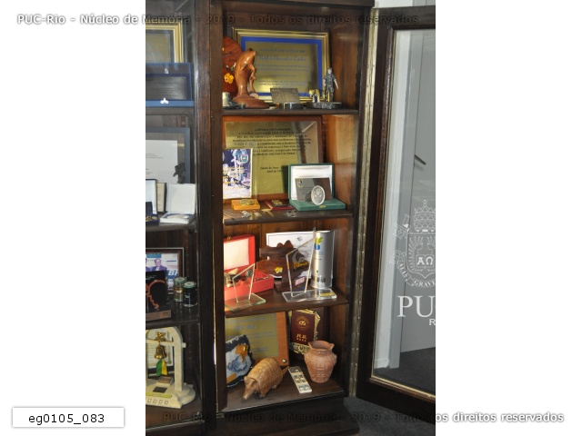 eg0105_083 | 11/1/2011 | Armário da sala de entrada da reitoria com medalhas, placas, diplomas, esculturas e prêmios recebidos de instituições de ensino superior e empresas, memorabílias da PUC-Rio e um porta-retrato do pe. Jesús Hortal Sànchez, S.J., com autoridade. |