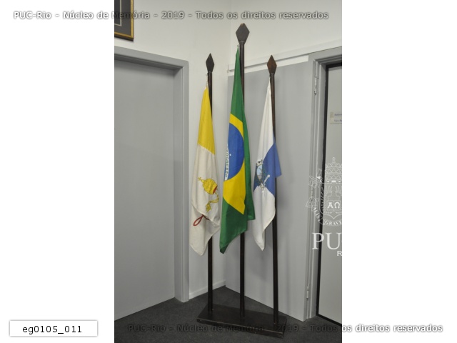 eg0105_011 | 11/1/2011 | Bandeiras da PUC-Rio, do Estado do Rio de Janeiro e do Brasil na sala de entrada da reitoria da PUC-Rio. |