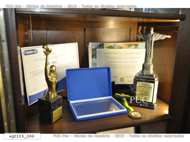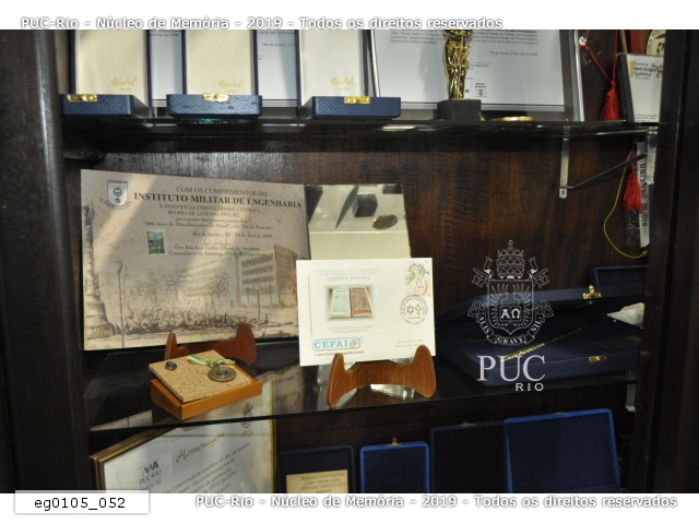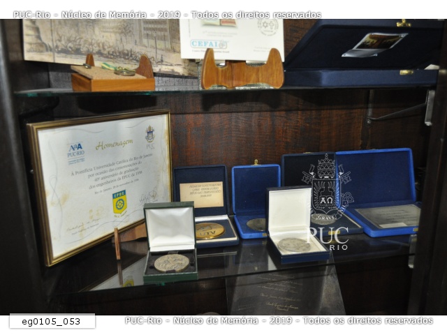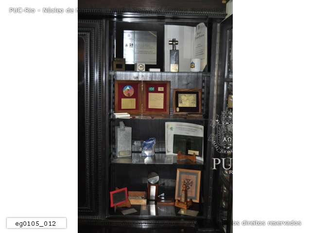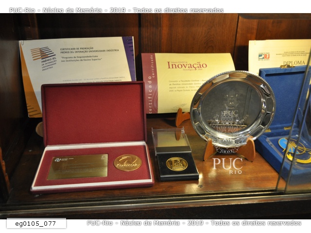 eg0105_053 | 11/1/2011 | Medalhas, diplomas e placas do armário da sala de entrada da reitoria recebidos de instituições de ensino superior e empresas ou confeccionados pela PUC-Rio. |