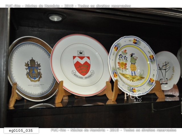 eg0105_035 | 11/1/2011 | Pratos brasonados do armário da sala de entrada da reitoria recebidos de instituições de ensino superior ou confeccionados pela PUC-Rio. |