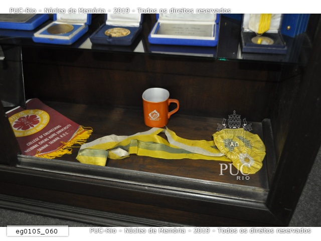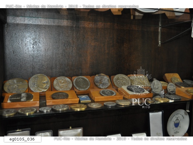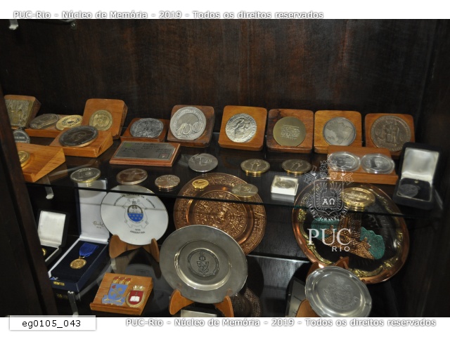 eg0105_036 | 11/1/2011 | Medalhas do armário da sala de entrada da reitoria recebidas de instituições de ensino superior ou confeccionadas pela PUC-Rio. |