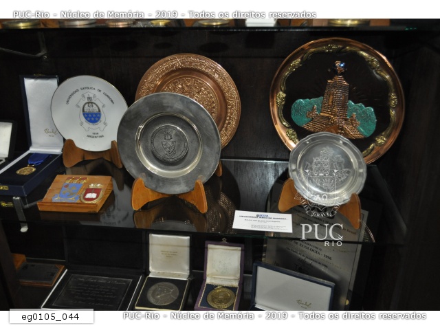 eg0105_044 | 11/1/2011 | Pratos brasonados, medalhas e placas do armário da sala de entrada da reitoria recebidos de instituições de ensino superior e empresas ou confeccionados pela PUC-Rio. |