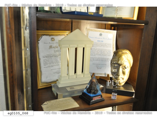 eg0105_068 | 11/1/2011 | Armário da sala de entrada da reitoria da PUC-Rio com as moções da Câmara Municipal do Rio de Janeiro concedidas à PUC-Rio e ao pe. Jesús Hortal Sànchez, S.J., placas, diplomas, esculturas e prêmios recebidos de instituições de ensino superior e empresas. |