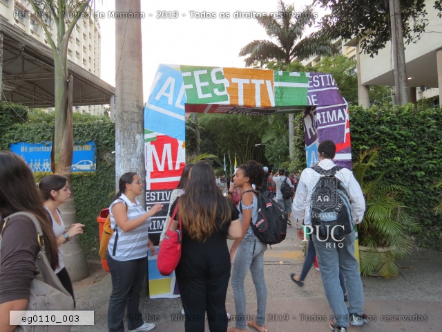 eg0110_003 | 7/11/2011 | Alunos na entrada do campus Gávea da PUC-Rio decorada para a divulgação da edição de 2011 do Festival de Primavera. |