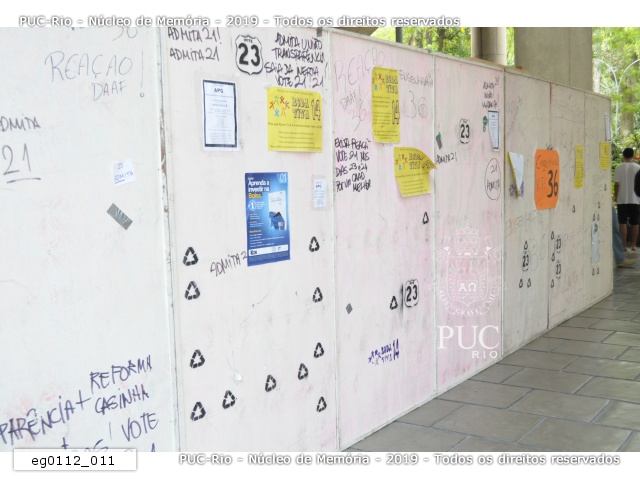eg0112_011 | 7/11/2011 | Painel fixado nos pilotis da ala Kennedy com propagandas das chapas que concorreram às eleições de 2011 para o Diretório Central dos Estudantes da PUC-Rio (DCE). Chapas Roda Viva, Reação, e outras. |