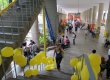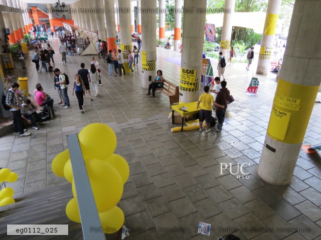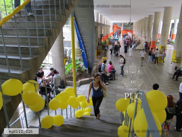 eg0112_039 | 7/11/2011 | Intervenção com faixas laranja e amarela, e balões amarelos, nas escadas e pilotis do edifício da Amizade, com propaganda de chapas que disputaram as eleições de 2011 para o Diretório Central dos Estudantes da PUC-Rio (DCE). Propaganda do Festival da Primavera e da Escola Brasileira de Nanotecnologia. |