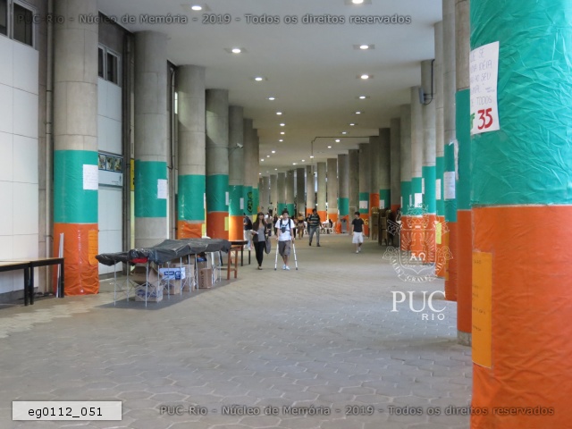 eg0112_041 | 7/11/2011 | Intervenção com faixas amarelas nos pilotis do edifício da Amizade, com propaganda de chapas que disputaram as eleições de 2011 para o Diretório Central dos Estudantes da PUC-Rio (DCE). Propaganda do Festival da Primavera. |
