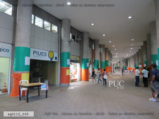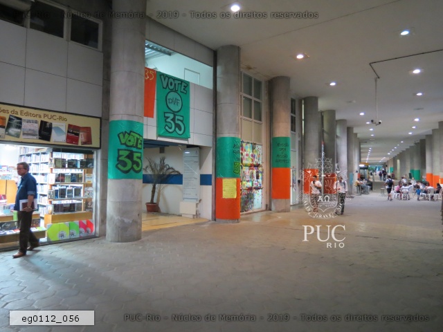 eg0112_056 | 7/11/2011 | Pilotis do edifício Cardeal Leme decorado com faixas laranja e verde com propagandas de chapas que disputavam as eleições de 2011 para o Diretório Central dos Estudantes da PUC-Rio (DCE). Em frente à livraria Carga Nobre e a Empresa Júnior. |