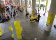 eg0112_025 | 7/11/2011 | Intervenção com faixas laranja e amarela, e balões amarelos, nas escadas e pilotis do edifício da Amizade, com propaganda de chapas que disputaram as eleições de 2011 para o Diretório Central dos Estudantes da PUC-Rio (DCE). Propaganda do Festival da Primavera. |