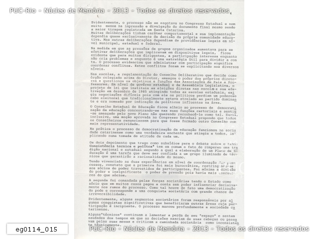 eg0114_031 | 11/1986 | Artigo intitulado 'Pós-Graduação e competência política', de autoria do professor Leandro Konder, apresentado no Seminário dos 20 anos do mestrado em Educação da PUC-Rio. |