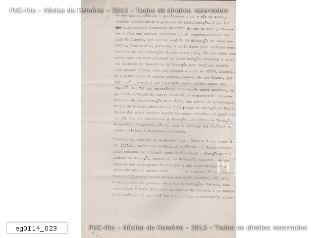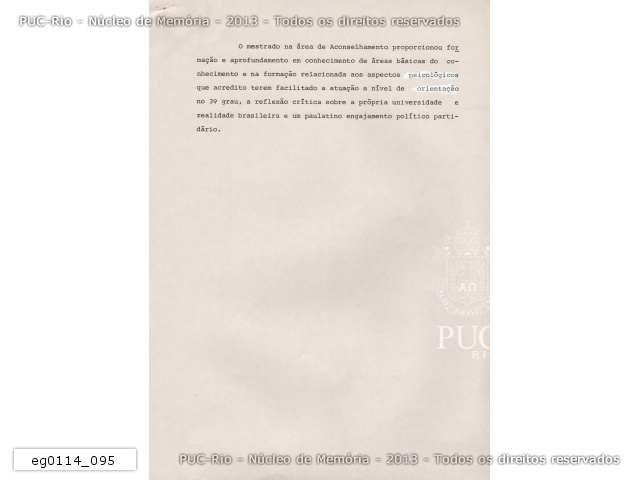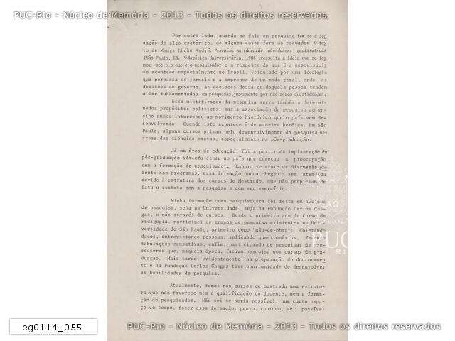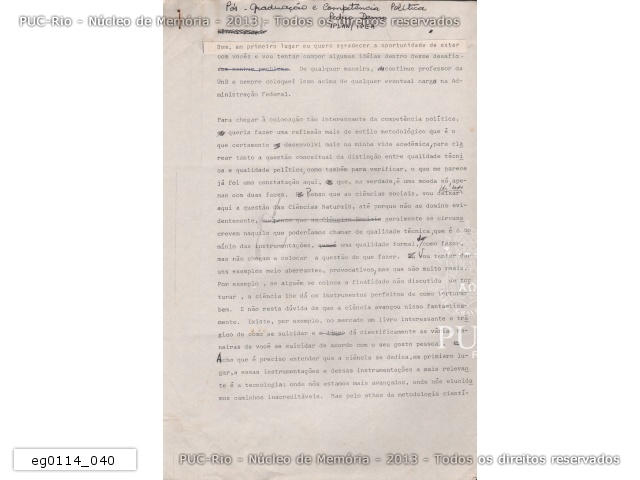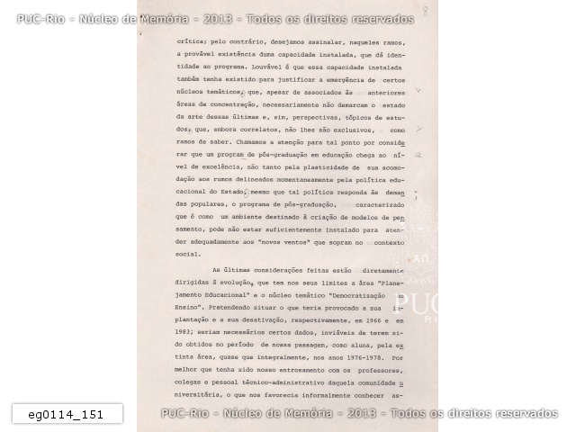 eg0114_023 | 11/1986 | Artigo intitulado 'Pós-Graduação e competência política', de autoria da professora Glaura Vasquez de Miranda, apresentado no Seminário dos 20 anos do mestrado em Educação da PUC-Rio. |