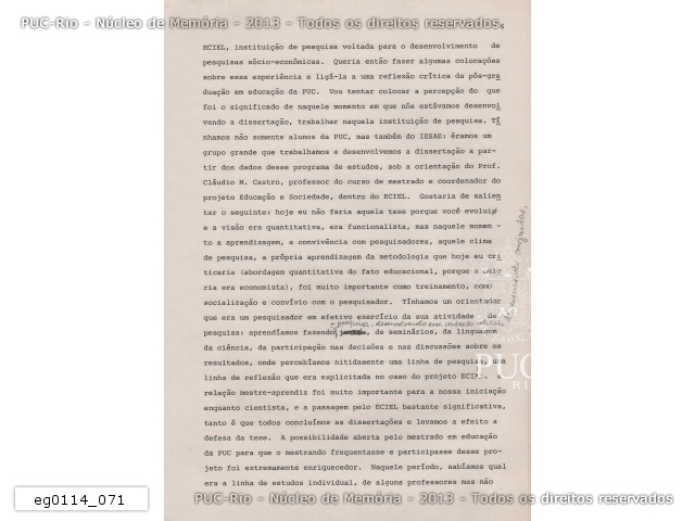 eg0114_119 | 11/1986 | Artigo intitulado 'Anotações sobre o pensamento educacional no Brasil' de autoria do professor Durmeval Trigueiro Mendes, apresentado no seminário dos 20 anos do mestrado em Educação da PUC-Rio. |