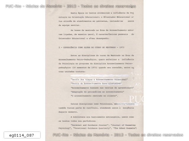 eg0114_095 | 11/1986 | Artigo intitulado 'Uma realidade de orientação educacional no 3º grau' de autoria da orientadora educacional Zilda Santesso, apresentado no seminário dos 20 anos do mestrado em Educação da PUC-Rio. |