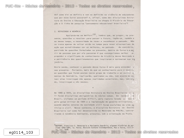 eg0114_103 | 11/1986 | Artigo intitulado 'Da estrutura do ensino ao pensamento educacional brasileiro' de autoria da professora Maria de Lourdes Fávero, apresentado no seminário dos 20 anos do mestrado em Educação da PUC-Rio. |