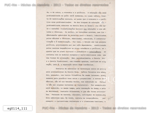 eg0114_120 | 11/1986 | Artigo intitulado 'Anotações sobre o pensamento educacional no Brasil' de autoria do professor Durmeval Trigueiro Mendes, apresentado no seminário dos 20 anos do mestrado em Educação da PUC-Rio. |