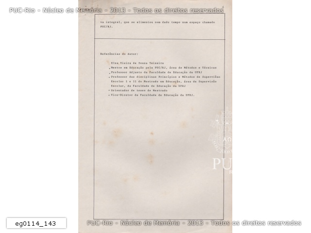 eg0114_143 | 11/1986 | Artigo intitulado 'Reflexões sobre um curso de mestrado na área de Métodos e Técnicas de Ensino' de autoria da professora Elza Vieira de Souza Teixeira, apresentado no seminário dos 20 anos do mestrado em Educação da PUC-Rio. |