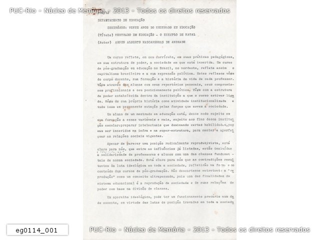 eg0114_001 | 11/1986 | Artigo intitulado 'Mestrado em Educação - a experiência de Natal', de autoria do professor Arnon Alberto Mascarenhas de Andrade, apresentado no Seminário dos 20 anos do mestrado em Educação da PUC-Rio. |