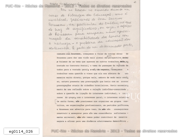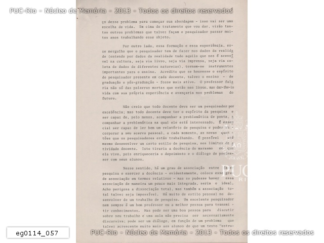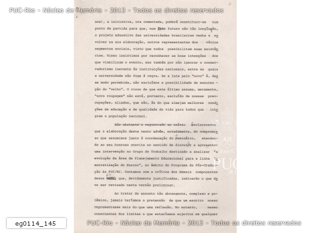 eg0114_113 | 11/1986 | Artigo intitulado 'Anotações sobre o pensamento educacional no Brasil' de autoria do professor Durmeval Trigueiro Mendes, apresentado no seminário dos 20 anos do mestrado em Educação da PUC-Rio. |
