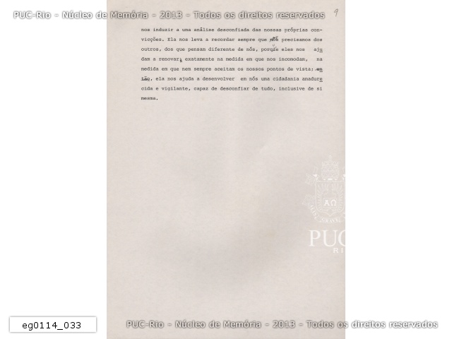 eg0114_033 | 11/1986 | Artigo intitulado 'Pós-Graduação e competência política', de autoria do professor Leandro Konder, apresentado no Seminário dos 20 anos do mestrado em Educação da PUC-Rio. |