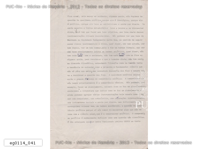 eg0114_041 | 11/1986 | Artigo intitulado 'Pós-graduação e competência política', de autoria do professor Pedro Demo, apresentado no Seminário dos 20 anos do mestrado em Educação da PUC-Rio. |