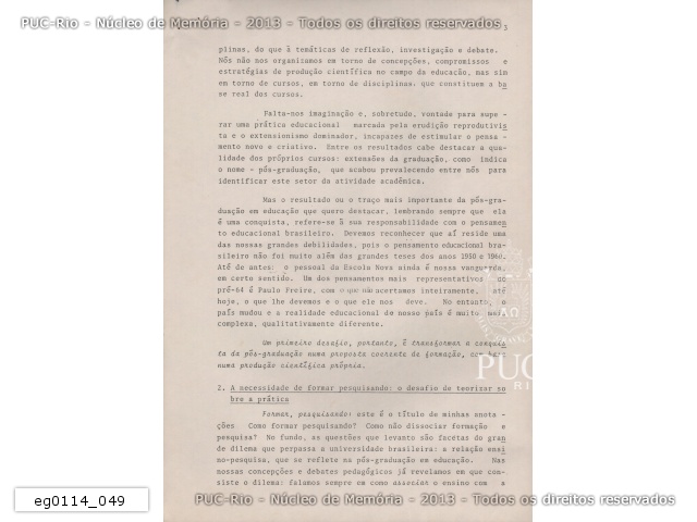 eg0114_049 | 11/1986 | Artigo intitulado 'Formar pesquisadores pesquisando: alguns desafios para a pós-graduação em educação', de autoria do professor Cândido Grzybowski, apresentado no Seminário dos 20 anos do mestrado em Educação da PUC-Rio. |