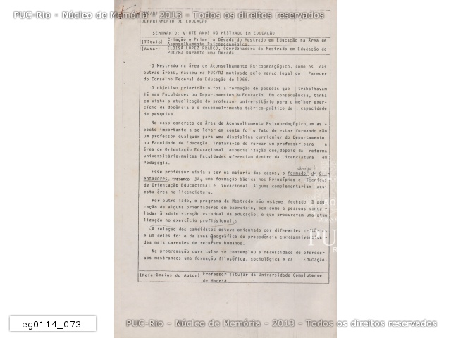 eg0114_073 | 11/1986 | Artigo intitulado 'Criação e primeira década do mestrado em Educação na área de Aconselhamento Psicopedagógico', de autoria da professora Eloísa Lopez Franco, apresentado no Seminário dos 20 anos do mestrado em Educação da PUC-Rio. |