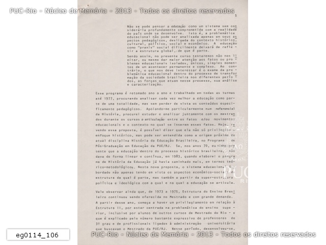 eg0114_106 | 11/1986 | Artigo intitulado 'Da estrutura do ensino ao pensamento educacional brasileiro' de autoria da professora Maria de Lourdes Fávero, apresentado no seminário dos 20 anos do mestrado em Educação da PUC-Rio. |