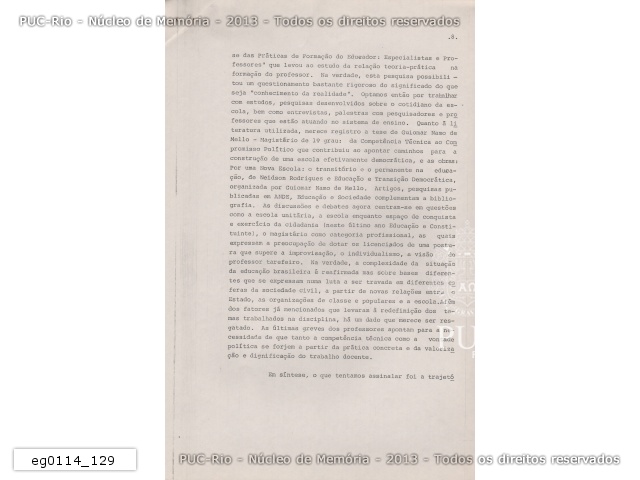 eg0114_129 | 11/1986 | Artigo intitulado 'Da estrutura do ensino à educação brasileira: reflexões sobre uma prática' de autoria das professoras Ana Walesca Mendonça e Isabel Alice Lellis, apresentado no seminário dos 20 anos do mestrado em Educação da PUC-Rio. |