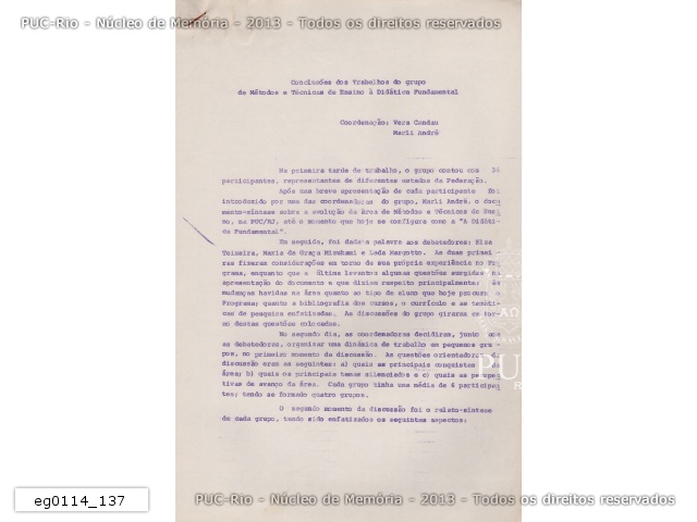 eg0114_137 | 11/1986 | Artigo intitulado 'Conclusões dos trabalhos do grupo de Métodos e Técnicas de Ensino à Didática Fundamental' de autoria das professoras Vera Maria Candau e Marli Eliza André, apresentado no seminário dos 20 anos do mestrado em Educação da PUC-Rio. |