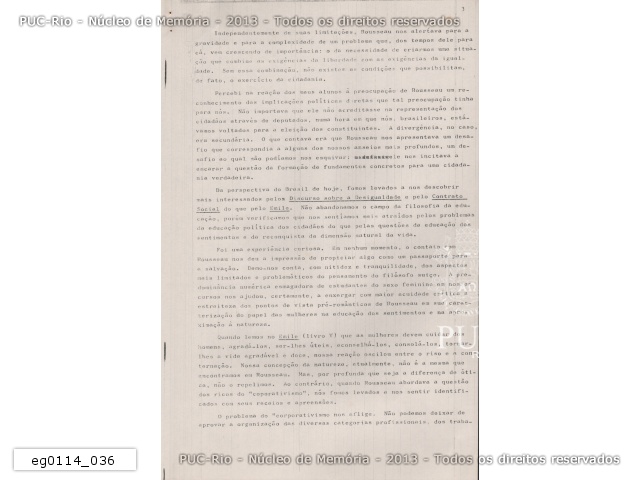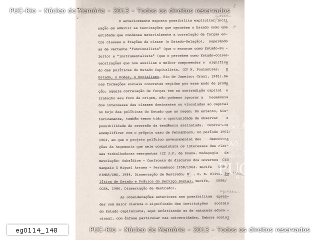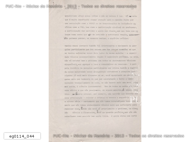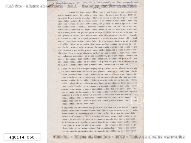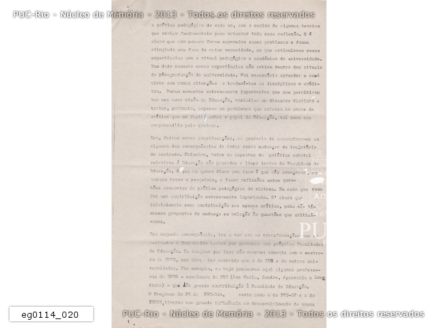eg0114_020 | 11/1986 | Artigo intitulado 'Pós-Graduação e competência política', de autoria da professora Glaura Vasquez de Miranda, apresentado no Seminário dos 20 anos do mestrado em Educação da PUC-Rio. |