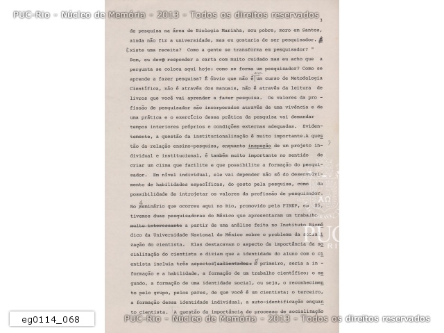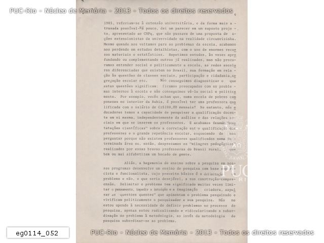 eg0114_052 | 11/1986 | Artigo intitulado 'Formar pesquisadores pesquisando: alguns desafios para a pós-graduação em educação', de autoria do professor Cândido Grzybowski, apresentado no Seminário dos 20 anos do mestrado em Educação da PUC-Rio. |