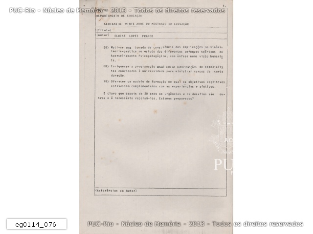 eg0114_076 | 11/1986 | Artigo intitulado 'Criação e primeira década do mestrado em Educação na área de Aconselhamento Psicopedagógico', de autoria da professora Eloísa Lopez Franco, apresentado no Seminário dos 20 anos do mestrado em Educação da PUC-Rio. |