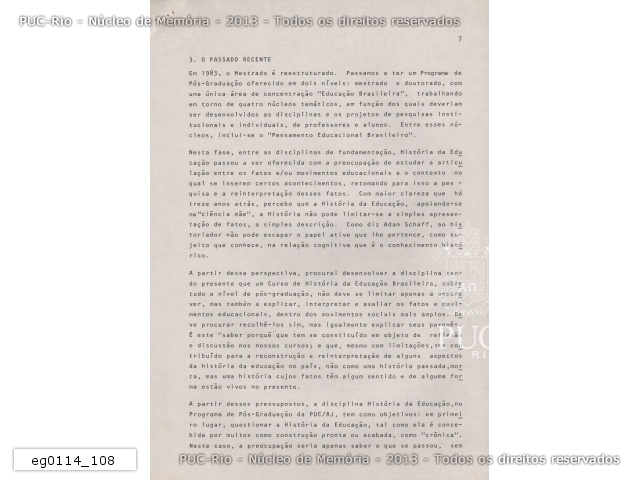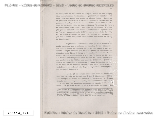 eg0114_108 | 11/1986 | Artigo intitulado 'Da estrutura do ensino ao pensamento educacional brasileiro' de autoria da professora Maria de Lourdes Fávero, apresentado no seminário dos 20 anos do mestrado em Educação da PUC-Rio. |
