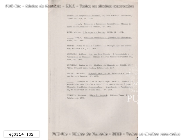 eg0114_132 | 11/1986 | Bibliografia do artigo intitulado 'Da estrutura do ensino à educação brasileira: reflexões sobre uma prática' de autoria das professoras Ana Walesca Mendonça e Isabel Alice Lellis, apresentado no seminário dos 20 anos do mestrado em Educação da PUC-Rio. |