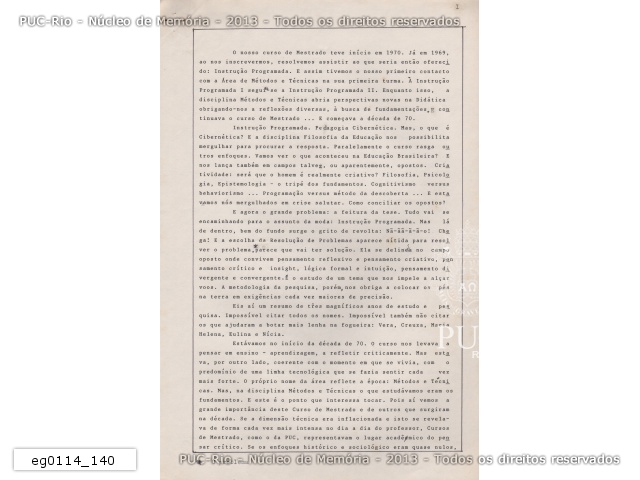eg0114_140 | 11/1986 | Artigo intitulado 'Reflexões sobre um curso de mestrado na área de Métodos e Técnicas de Ensino' de autoria da professora Elza Vieira de Souza Teixeira, apresentado no seminário dos 20 anos do mestrado em Educação da PUC-Rio. |