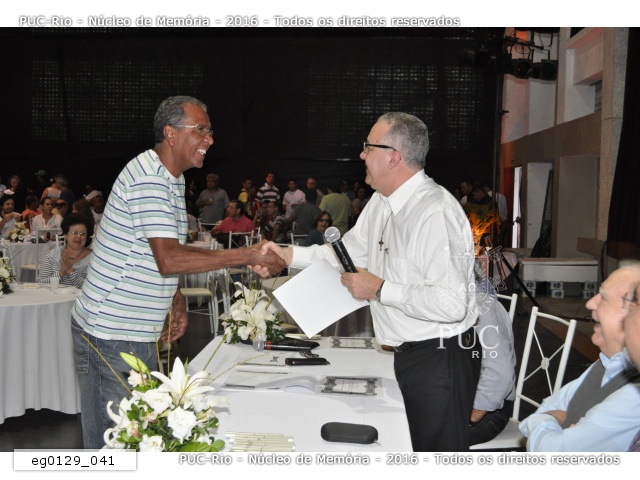 eg0129_008 | 22/10/2010 | O funcionário Enimar Lopes recebe o diploma de Honra ao Mérito das mãos do Padre Ivern S.J. em agradecimento aos 40 anos de trabalho na PUC-Rio. |