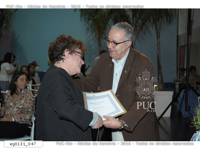 eg0131_031 | 19/10/2012 | A professora Rosa Marina Meyer recebe do Reitor Padre Josafá S.J. o diploma de Honra ao Mérito em agradecimento aos 35 anos de trabalho na PUC-Rio. |