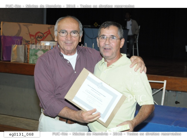eg0131_052 | 19/10/2012 | O professor Júlio Cesar Diniz recebe do Reitor Padre Josafá S.J. o diploma de Honra ao Mérito em agradecimento aos 25 anos de dedicação à PUC-Rio. |