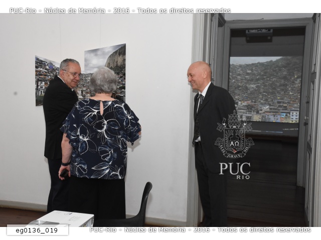 eg0136_018 | 26/7/2018 | A profa. Margarida mostra foto da Rocinha exposta na exposição "Gávea - Território de Diversidades, Morada de Contradições", de autoria do fotógrafo Robert Polidori, para o Reitor Pe. Josafá S.J. e o prof. Karl Erik. |