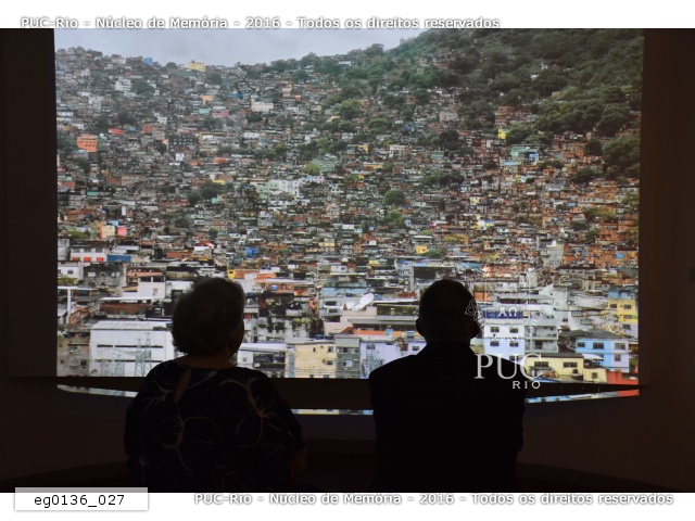 eg0136_035 | 26/7/2018 | O funcionário Clóvis Gorgônio e Wanderlucy Bezerra assistem os vídeos do projeto Memória Rocinha, em exibição na sala "Memórias e contrastes", na exposição "Gávea - Território de Diversidades, Morada de Contradições". |