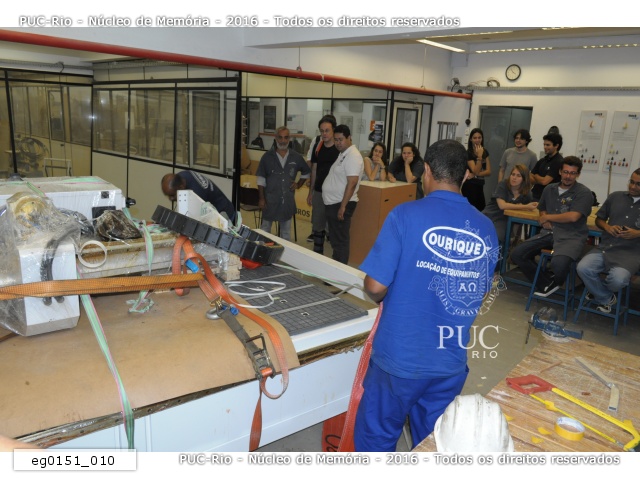 eg0151_004 | 25/10/2012 | Guindaste suspende os novos equipamentos do Laboratório de Volume e Prototipagem. |